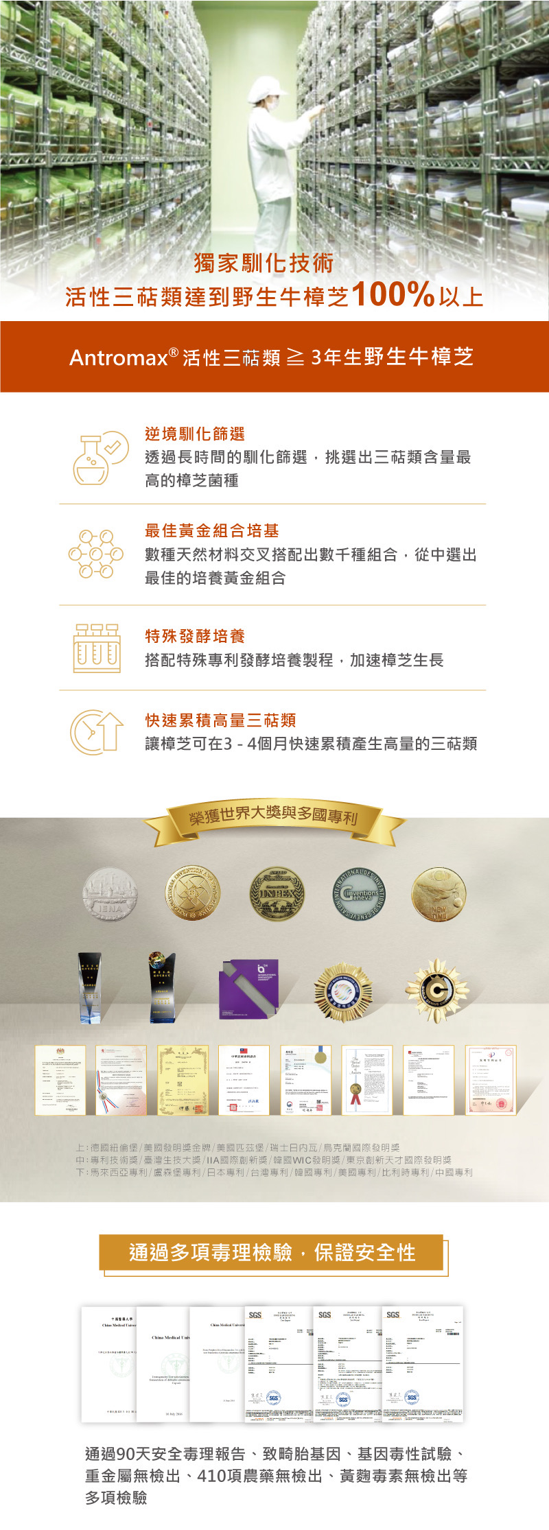 高品質的專利牛樟芝菌絲體原料,榮獲德、美、台、日、中等多國專利認證,且為全球首例通過美國食品藥物管理局(US FDA)認證的新膳食原料(NDI),更獲得德國紐倫堡、瑞士日內瓦、美國匹茲堡、韓國WIC、日本東京等多項國際發明獎殊榮。