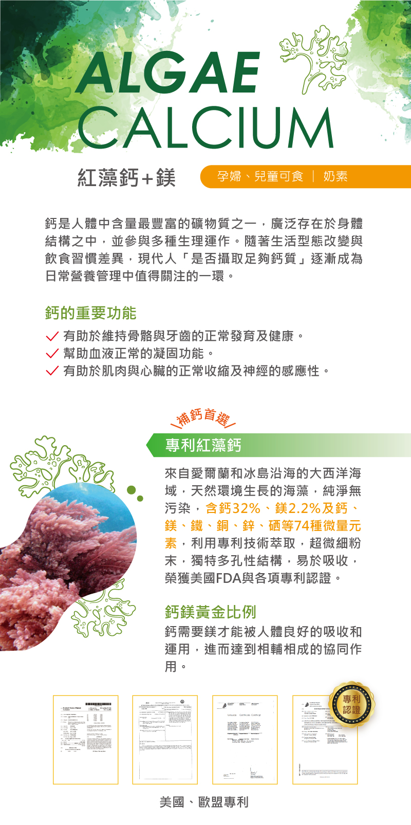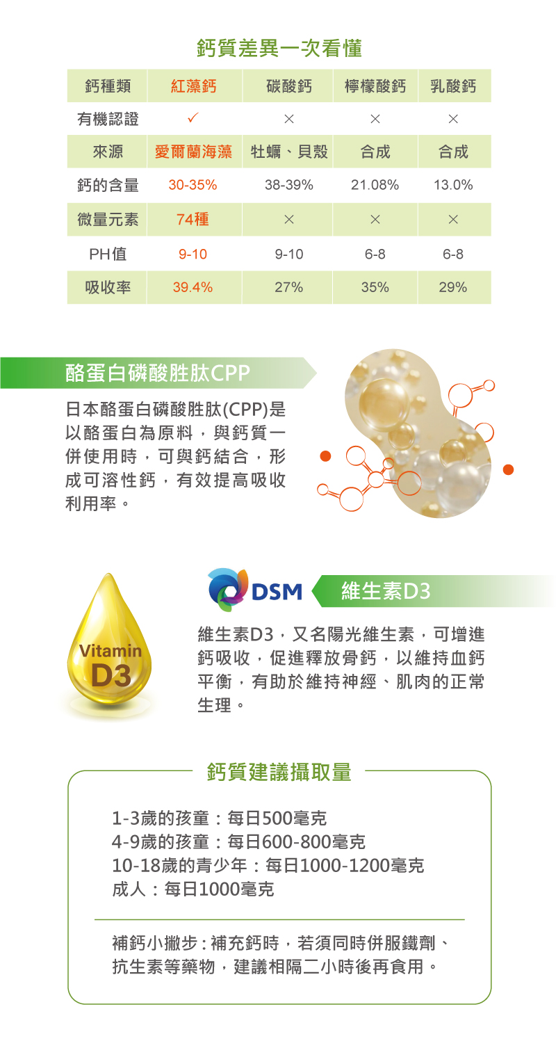 紅藻鈣源自天然海洋紅藻,富含多種礦物質,具有高吸收率與溫和好消化的特性,是現代人補鈣的理想選擇。與一般鈣源相比,紅藻鈣結構更接近人體所需,愛爾蘭原廠的專利技術,讓粉末細緻化,更能提高吸收率!